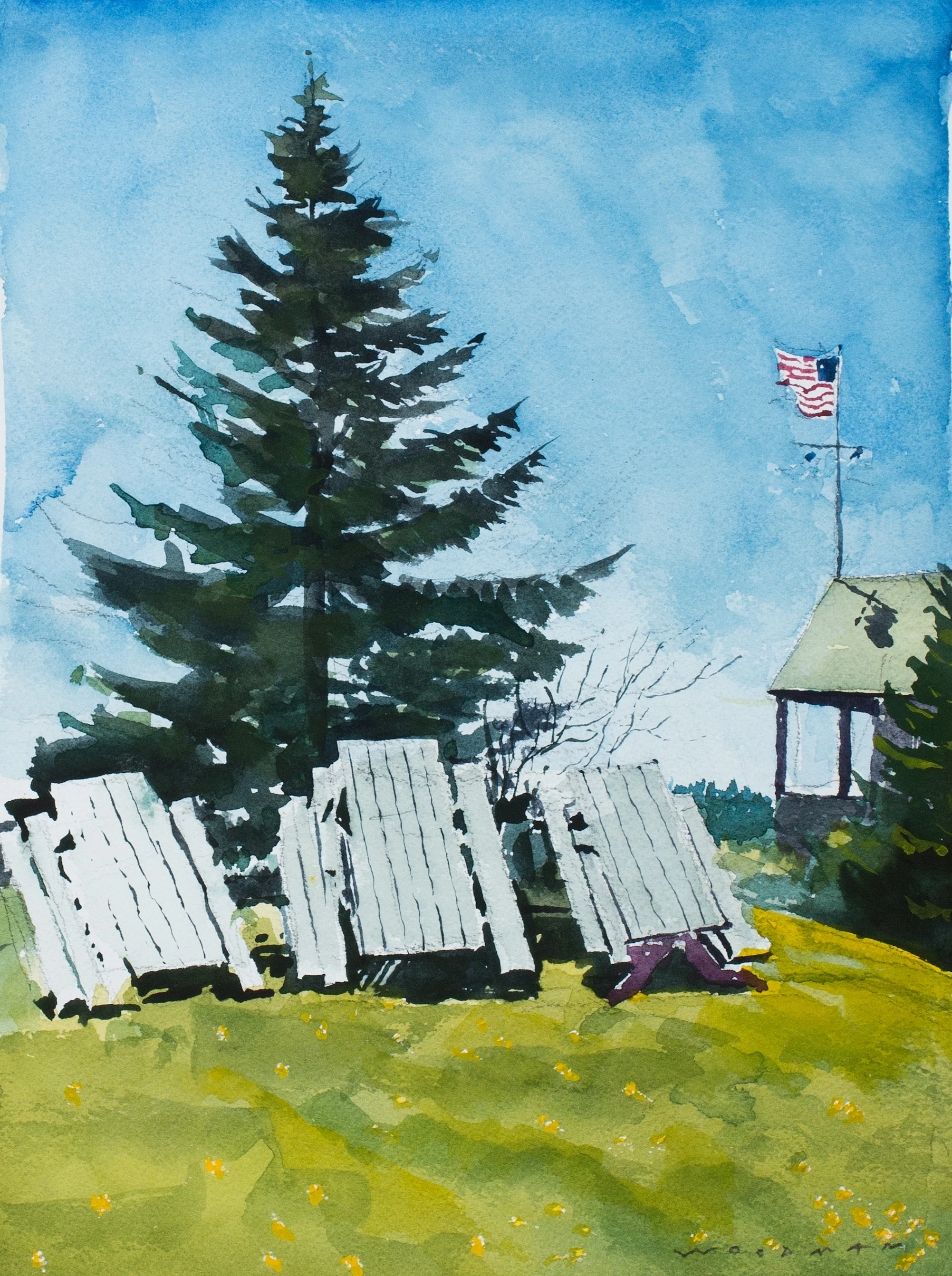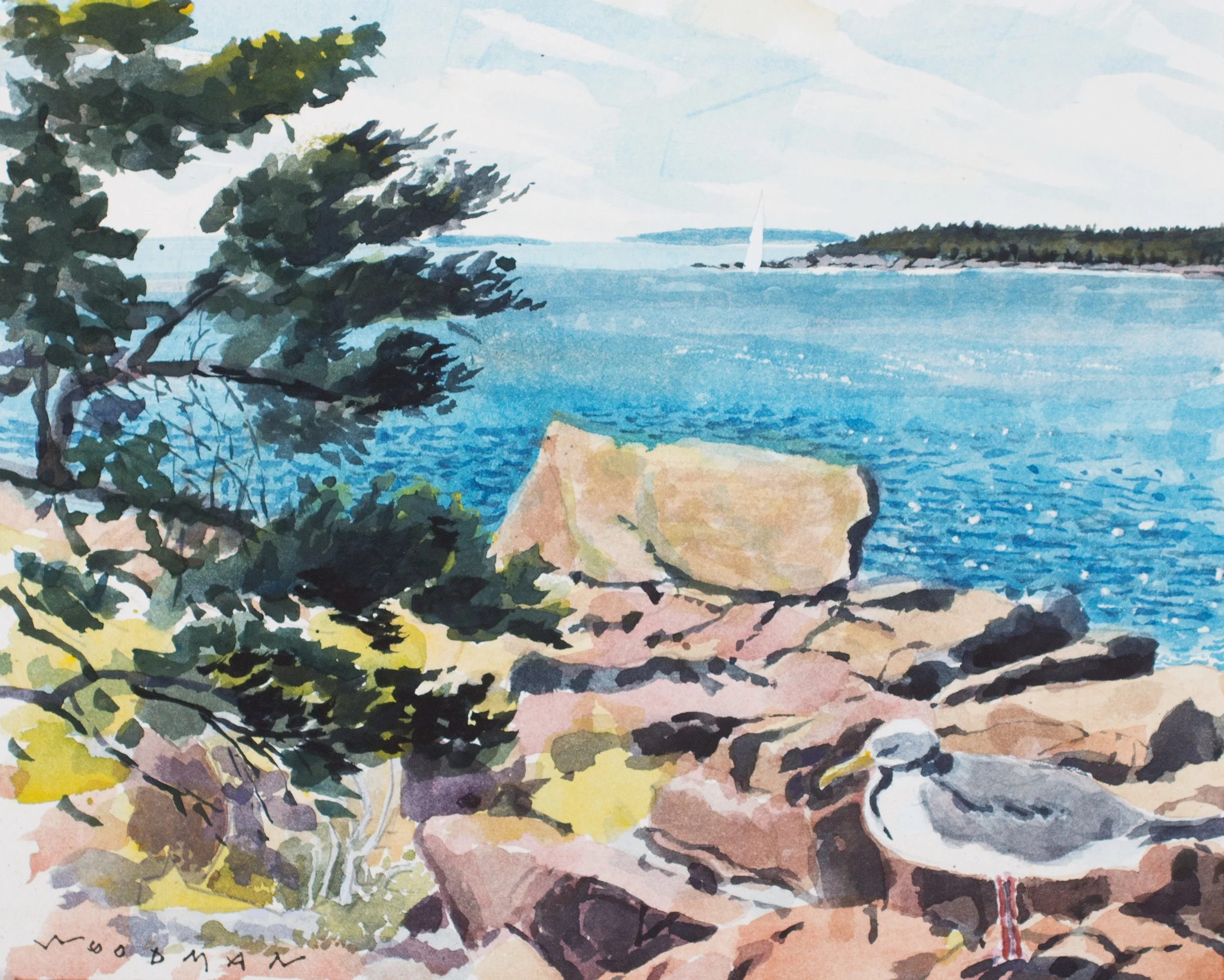 A local artist with a national reputation, Bill Woodman occupies a unique position within Maine’s artistic landscape. Born in Bangor in 1936, Bill joined the Navy, and then moved to New York City to begin his cartooning career. Over the next four decades, Bill’s cartoons were featured in major publications ranging from the National Lampoon to Esquire, Barron's, and The New York Times. He had a longstanding contract with Playboy and became known as one of The New Yorker's classic cartoonists. Since returning to Maine in 2000, Bill has created cartoons for Down East Magazine and devoted himself to painting plein-air landscapes. His paintings capture the essence of Maine, depicting its rocky coastlines and historic downtowns in vibrant watercolor.
